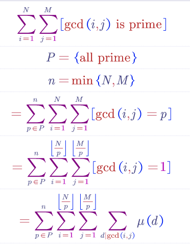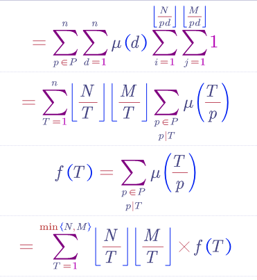 1 #include <ctime> 2 #include <cmath> 3 #include <cstdio> 4 #include <cstring> 5 #include <cstdlib> 6 #include <iostream> 7 #include <algorithm> 8 #include <cassert> 9 #include <vector> 10 #include <queue> 11 #define inf 10000010 12 #define INF 0x7fffffff 13 #define ll long long 14 15 namespace chiaro{ 16 17 template <class I> 18 inline void read(I &num){ 19 num = 0; char c = getchar(), up = c; 20 while(c < '0' || c > '9') up = c, c = getchar(); 21 while(c >= '0' && c <= '9') num = (num << 1) + (num << 3) + (c ^ '0'), c = getchar(); 22 up == '-' ? num = -num : 0; return; 23 } 24 template <class I> 25 inline void read(I &a, I &b) {read(a); read(b);} 26 template <class I> 27 inline void read(I &a, I &b, I &c) {read(a); read(b); read(c);} 28 29 int n, m; 30 std::vector <int> prime; 31 int mu[inf]; 32 ll f[inf], sum[inf]; 33 34 inline void shaiMu(int n) { 35 prime.reserve(665000); 36 static bool not_prime[inf]; 37 not_prime[0] = not_prime[1] = 1; 38 mu[1] = 1; 39 for(int i = 1; i <= n; i++) { 40 if(not_prime[i] == 0) { 41 mu[i] = -1; 42 prime.push_back(i); 43 } 44 for(auto j: prime) { 45 if(1ll * i * j > n) break; 46 not_prime[i * j] = 1; 47 if(i % j == 0) { 48 mu[i * j] = 0; 49 break; 50 } 51 mu[i * j] = -mu[i]; 52 } 53 } 54 } 55 56 inline void getSum(int n) { 57 for(auto i: prime) { 58 for(int j = 1; j * i <= n; j++) f[i * j] += mu[j]; 59 } 60 for(int i = 1; i <= n; i++) sum[i] = sum[i - 1] + f[i]; 61 } 62 63 inline void solve () { 64 read(n, m); 65 int N = std::min (n, m); 66 ll ans = 0; 67 for(int i = 1, j = 0; i <= N; i = j + 1) { 68 j = std::min (n / (n / i), m / (m / i)); 69 ans += 1ll * (n / i) * (m / i) * (sum[j] - sum[i - 1]); 70 } 71 printf("%lld\n", ans); 72 } 73 74 inline int main(){ 75 int T; read(T); 76 shaiMu(1e7); 77 getSum(1e7); 78 while(T--) solve(); 79 return 0; 80 } 81 82 } 83 84 signed main(){ return chiaro::main();}