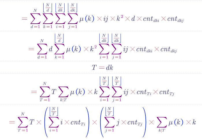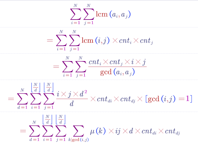 1 #include <ctime> 2 #include <cmath> 3 #include <cstdio> 4 #include <cstring> 5 #include <cstdlib> 6 #include <iostream> 7 #include <algorithm> 8 #include <vector> 9 #include <queue> 10 #define inf 100010 11 #define INF 0x7fffffff 12 #define ll long long 13 14 namespace chiaro{ 15 16 template <class I> 17 inline void read(I &num){ 18 num = 0; char c = getchar(), up = c; 19 while(c < '0' || c > '9') up = c, c = getchar(); 20 while(c >= '0' && c <= '9') num = (num << 1) + (num << 3) + (c ^ '0'), c = getchar(); 21 up == '-' ? num = -num : 0; return; 22 } 23 template <class I> 24 inline void read(I &a, I &b) {read(a); read(b);} 25 template <class I> 26 inline void read(I &a, I &b, I &c) {read(a); read(b); read(c);} 27 28 int n; 29 int a[inf], cnt[inf]; 30 int mu[inf]; 31 ll smu[inf]; 32 33 inline void shaiMu(int n) { 34 static bool not_prime[inf]; 35 std::vector <int> prime; 36 not_prime[0] = not_prime[1] = 1; 37 mu[1] = 1; 38 for(int i = 2; i <= n; i++) { 39 if(not_prime[i] == 0) { 40 mu[i] = -1; 41 prime.push_back(i); 42 } 43 for(auto j: prime) { 44 if(j * i > n) break; 45 not_prime[j * i] = 1; 46 if(i % j == 0) { 47 mu[i * j] = 0; 48 break; 49 } 50 mu[i * j] = -mu[i]; 51 } 52 } 53 } 54 55 inline int main(){ 56 read(n); 57 int tmp = 0; 58 for(int i = 1; i <= n; i++) { 59 read(a[i]); 60 ++cnt[a[i]]; 61 tmp = std::max(tmp, a[i]); 62 } 63 n = tmp; 64 shaiMu(n); 65 for(int i = 1; i <= n; i++) { 66 for(int j = i; j <= n; j += i) { 67 smu[j] += 1ll * mu[i] * i; 68 } 69 } 70 ll ans = 0; 71 for(int T = 1; T <= n; T++) { 72 ll scnt = 0; 73 for(int i = 1, I = n / T; i <= I; i++) { 74 scnt += 1ll * i * cnt[i * T]; 75 } 76 ans += 1ll * T * scnt * scnt * smu[T]; 77 } 78 std::cout << ans << '\n'; 79 return 0; 80 } 81 82 } 83 84 signed main(){ return chiaro::main();}