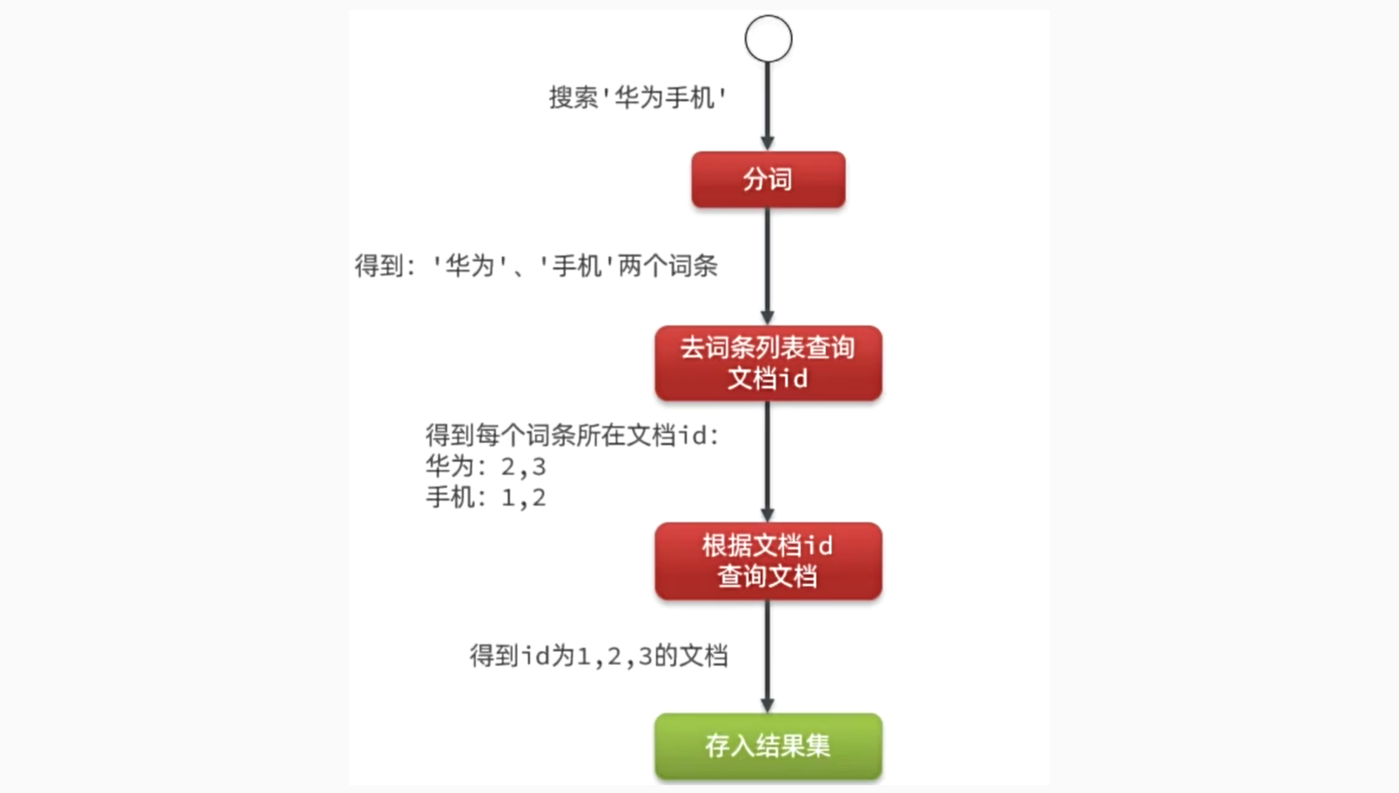 对文档内容分词,对分词后的词条创建索引,并记录词条所在文档的id。查询时先根据词条查询到文档id,而后根据文档id查询文档。 -