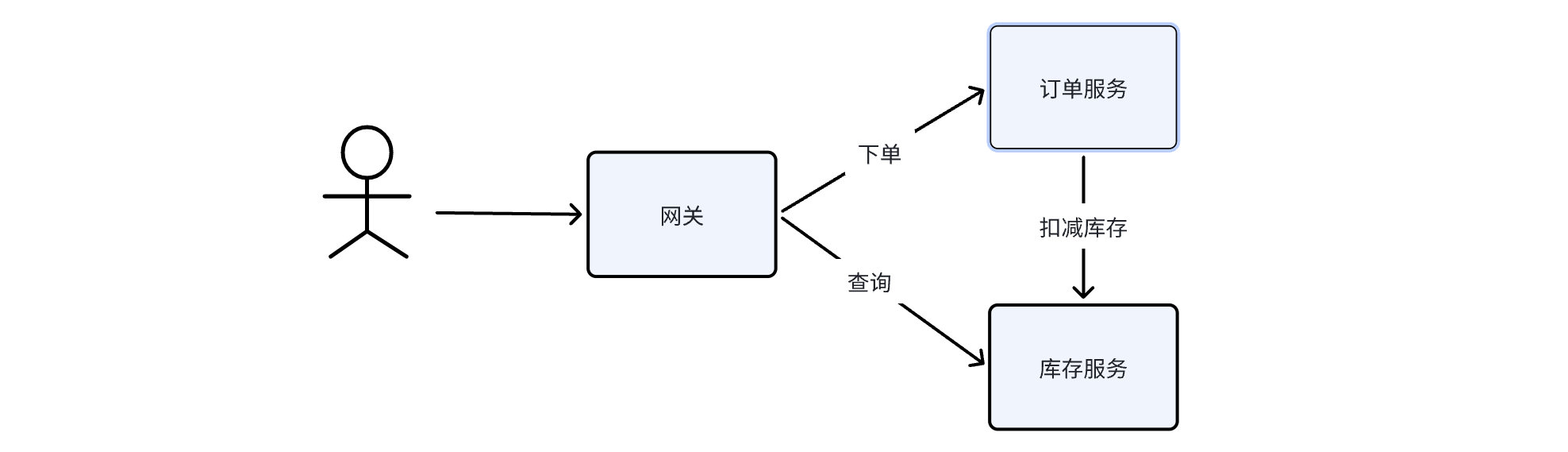 一致性: 向系统写一个新数据再次读取到的也一定是这个新数据。拿上图举例,请求订单服务下单,订单服务请求库存服务扣减库存,只要下单成功则库存扣减成功。