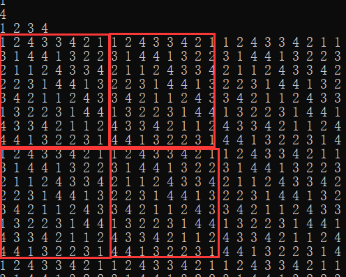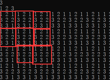 一道规律题,只不过这个规律有点难发现,先是依据题目把矩阵打出来发现是这样的