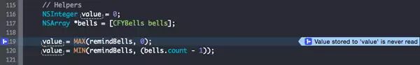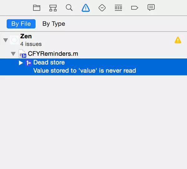 使用Xcode来分析你的项目,从Xcode的 Product菜单选择 Analyze或按 Shift-Command-B.Xcode的将需要片刻的时间,但是当它完成的时候你会在左边的 Issue Navigator看到问题列表。由Analyze发现的问题用蓝色高亮显示。