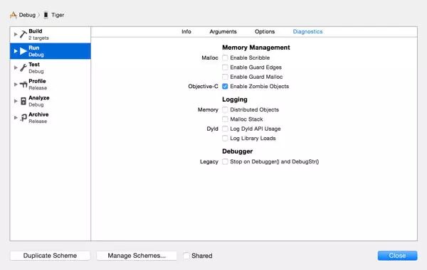 在左侧选中Run ,在上方打开 Diagnostics选项。要启用僵尸对象,勾选 Enable Zombie Objects选框。