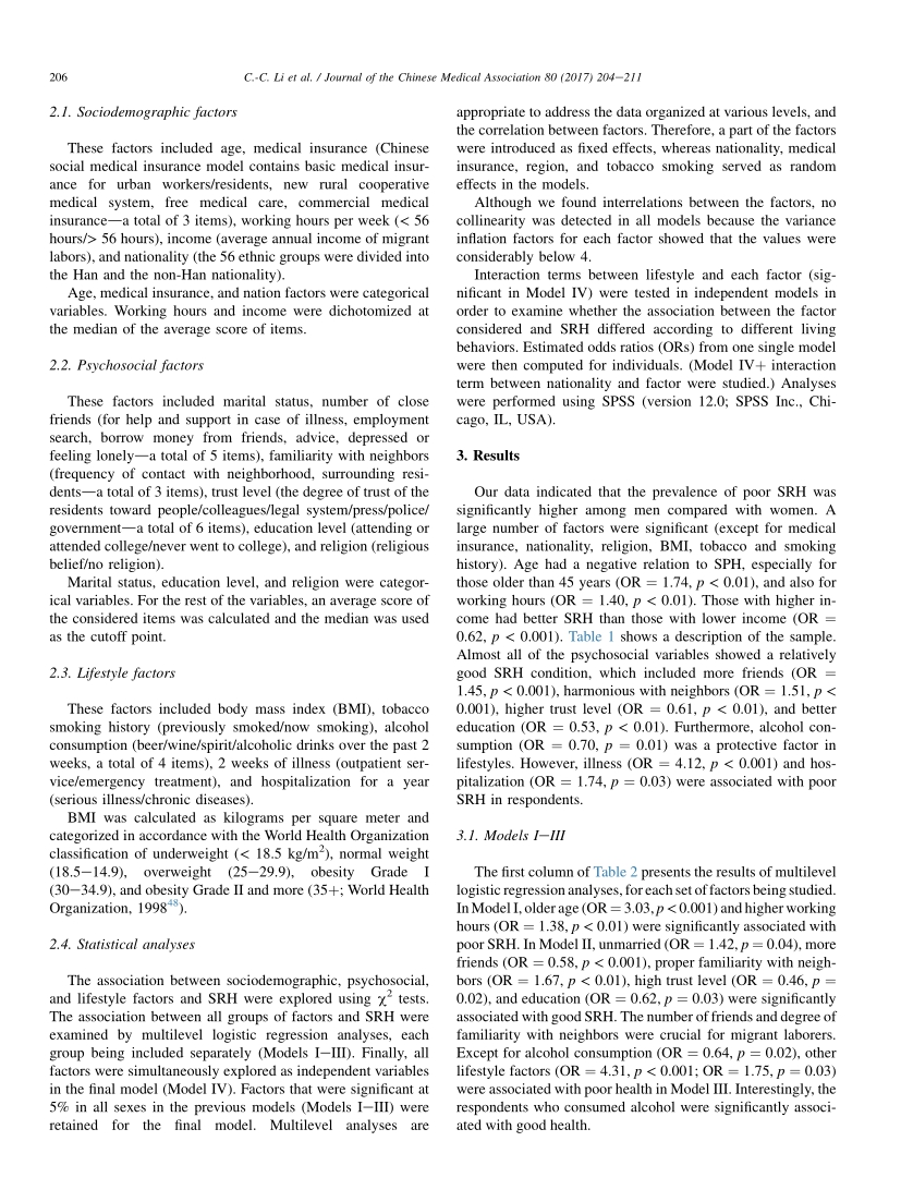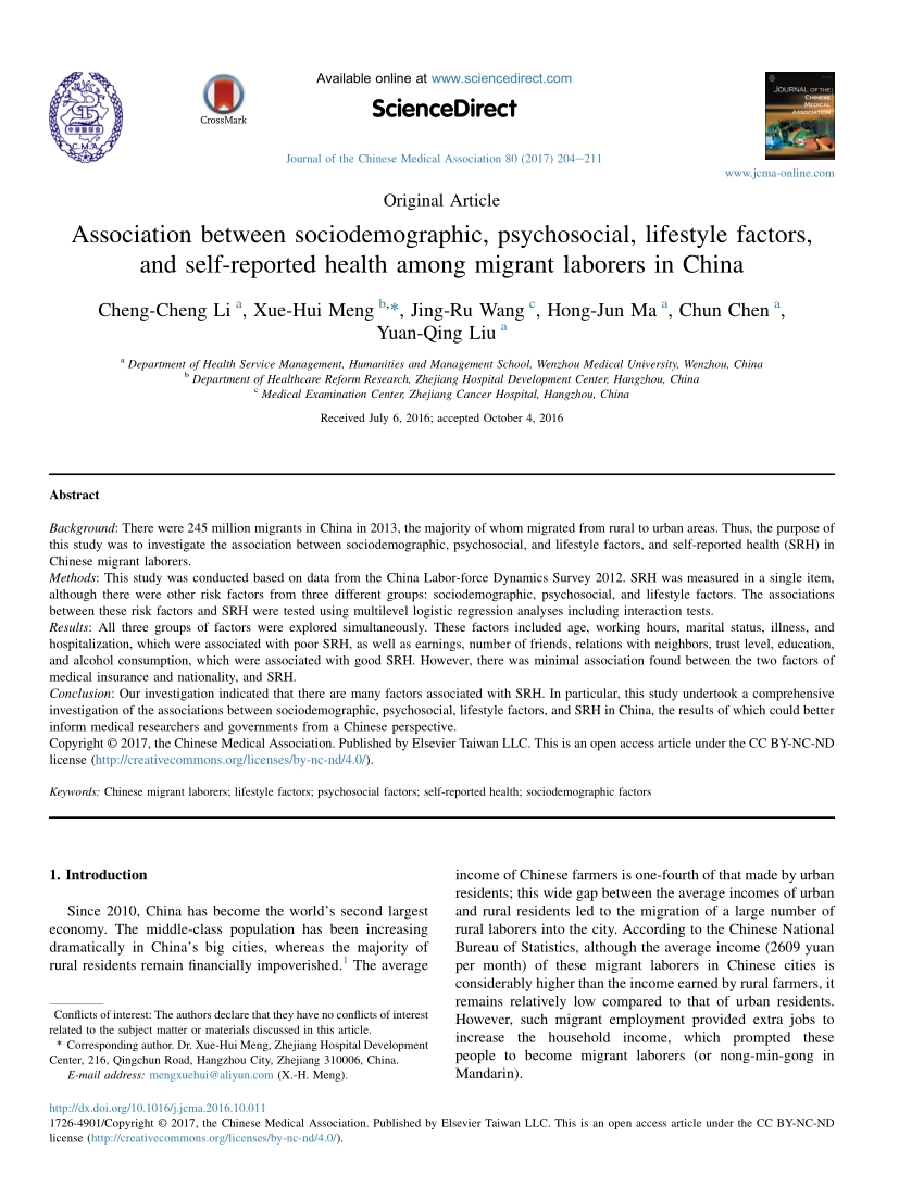 Association between sociodemographic, psychosocial, lifestyle factors, and self-reported health among migrant laborers in China
