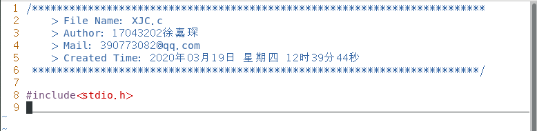 d)创建并打开一个以.c结尾的文件,如vim XJC.c