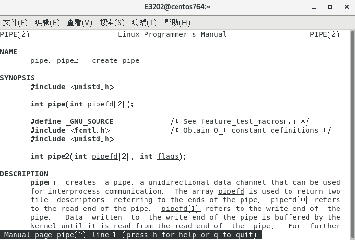它的参数是一个大小为 2 的数组。此数组的第 0 个元素用来接收以读的方式打开的描述符,而第 1 个元素用来接收以写的方式打开的描述符。也就是说, pipefd[0] 是用于读的,而 pipefd[1] 是用于写的。