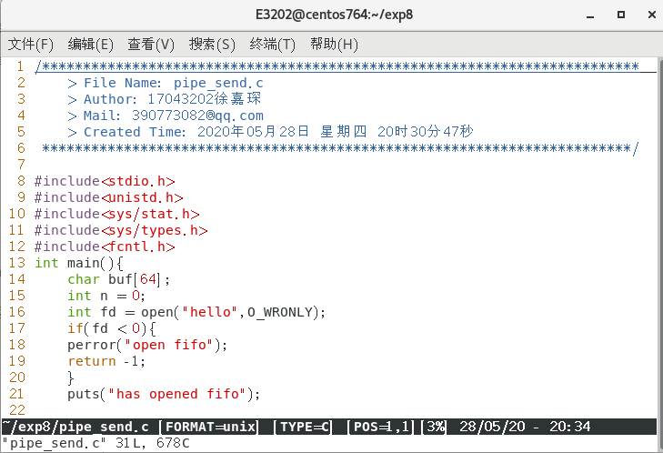 编写两个程序,分别是发送端 pipe_send 和接收端面 pipe_recv 。程序 pipe_send 从标准输入接收字符,并发送到程序 pipe_recv ,同时 pipe_recv 将接收到的字符打印到屏幕。