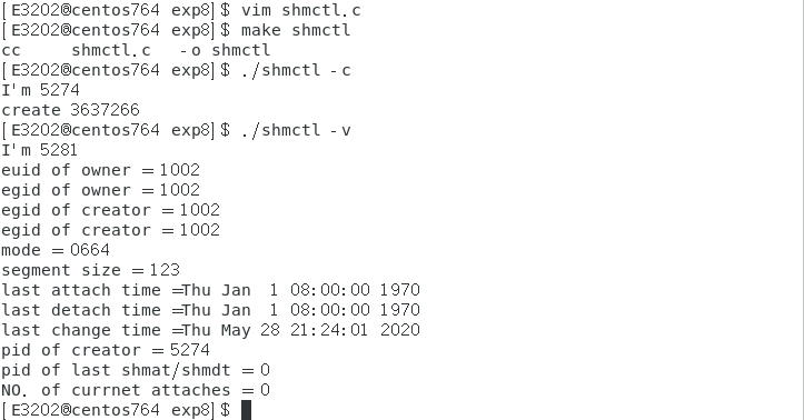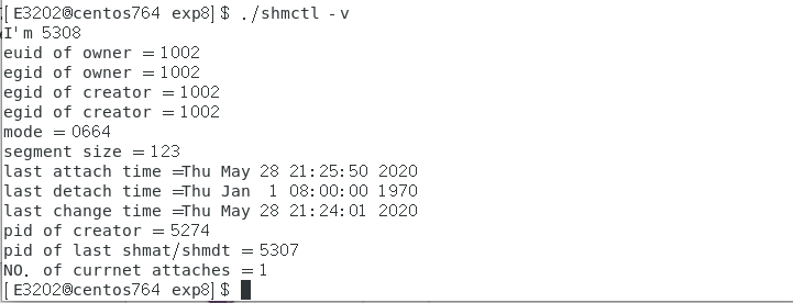 先在另一个终端执行 ./shmctl -a ,然后在当前终端执行 ./shmctl -v (注意手速,5秒内要搞定)。