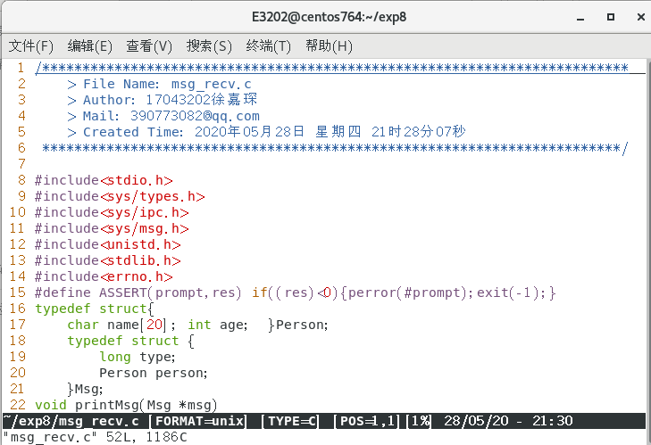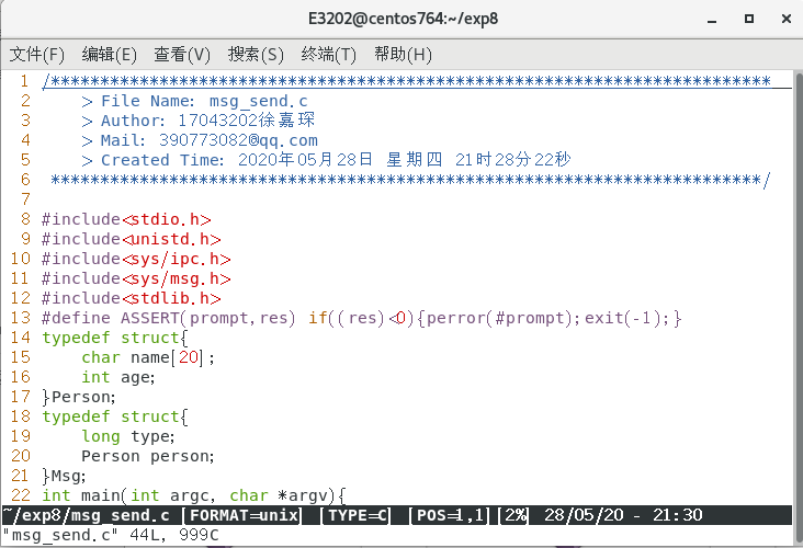 程序 msg_send 和 msg_recv 分别用于向消息队列发送数据和接收数据。 msg_send 程序定义了一个结构体 Msg ,消息正文部分是结构体 Person 。该程序向消息队列发送了 10 条消息。