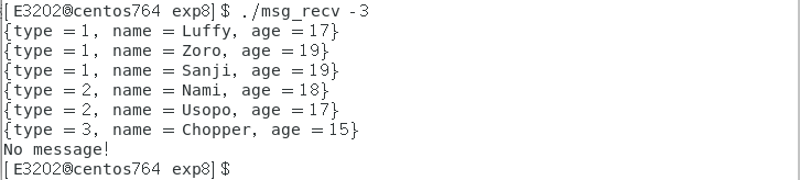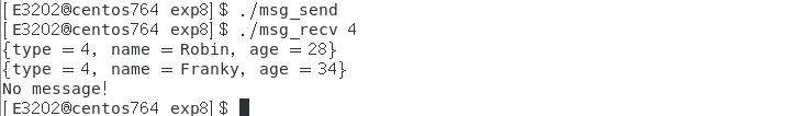 msg_recv 程序接收一个参数,表示接收哪种类型的消息。比如 ./msg_recv 4 表示接收类型为 4 的消息,并打印在屏幕。
