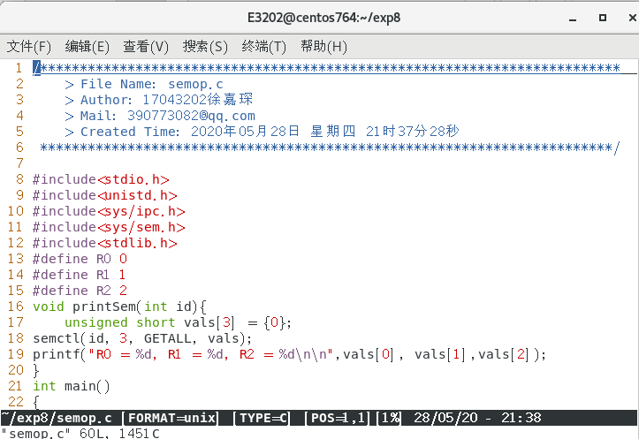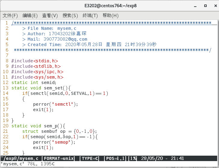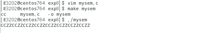 这里可以看到字符是成对出现的,如果大家修改程序把57行 sem_p(); 和64行 sem_v(); 注释掉,在编译运行会发现字符可能就不会成对出现了,这里就是用信号量来帮我们实现进程间的同步的。