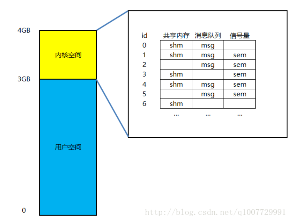 进程空间的高 1G 空间( 3GB-4GB )是内核空间,该空间中保存了所有的 IPC 内核对象。上图给出不同的 IPC 内核对象在内存中的布局(以数组的方式),实际操作系统的实现并不一定是数组,也可能是链表或者其它数据结构等等。每个内核对象都有自己的 id 号(数组的索引)。此 id 号可以被用户空间使用。所以只要用户空间知道了内核对象的 id 号,就可以操控内核对象了。
