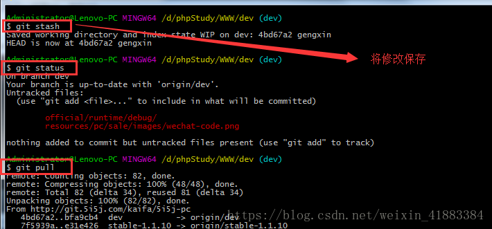 1.可以先执行git stash 将本地修改保存起来。 这样本地就干净了。git status后看不见修改的文件
