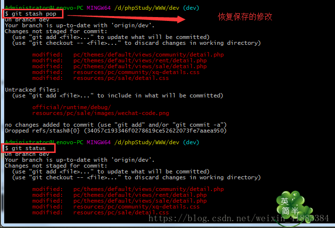 3.git stash pop恢复最新的进度到工作区。git默认会把工作区和暂存区的改动都恢复到工作区。git status后就可以看见之前修改的文件