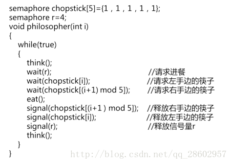 (1)至多只允许四位哲学家同时去拿左筷子,最终能保证至少有一位哲学家能进餐,并在用完后释放两只筷子供他人使用。