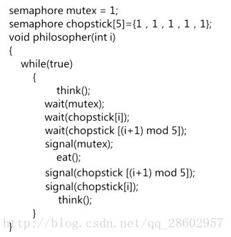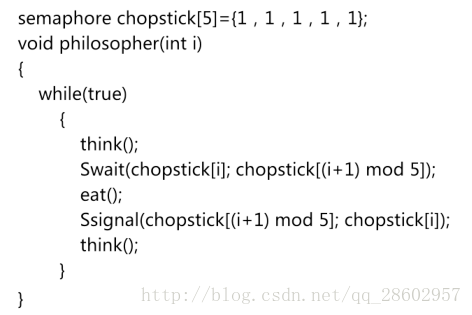 注意:若五位哲学家同时饥饿而各自拿起了左边的筷子,这使五个信号量 chopstick 均为 0,当他们试图去拿起右边的筷子时,都将因无筷子而无限期地等待下去,即可能会引起死锁。