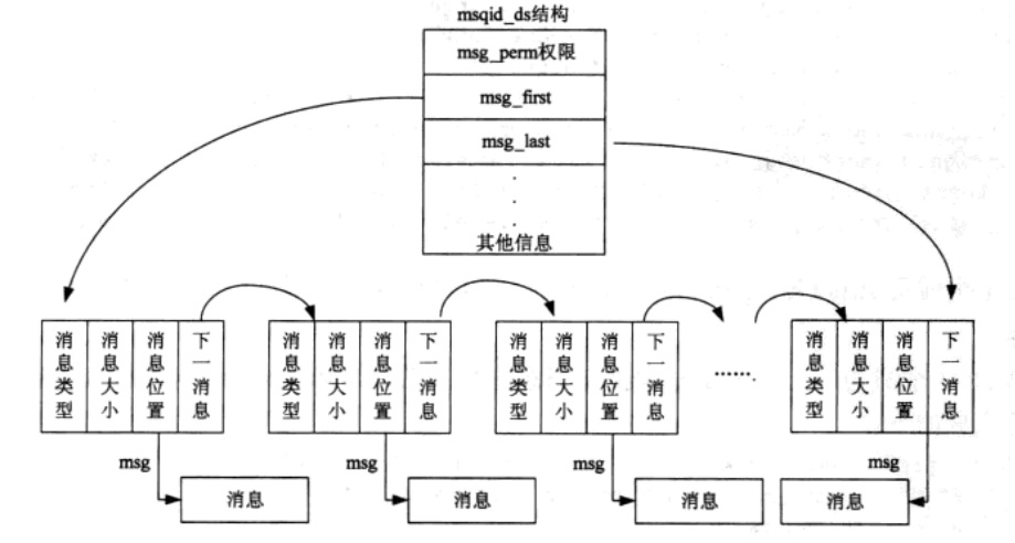 (2)msg消息数据结构:整个消息队列的主体,一个消息队列有若干个消息,每个消息数据结构的基本成员包括消息类型、消息大小、消息内容指针和下一个消息数据结构位置。
