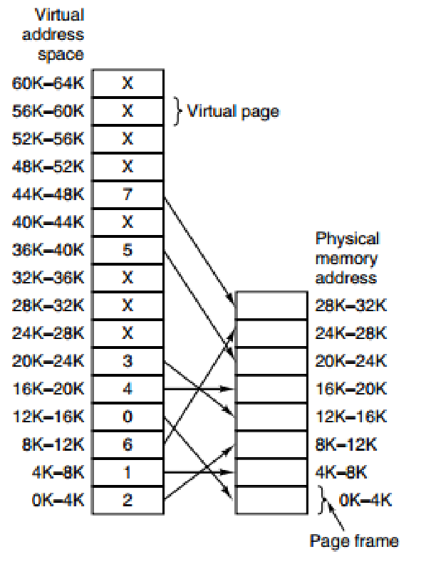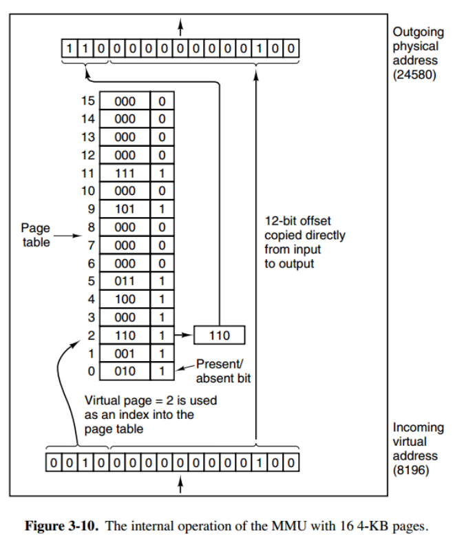 例子:下图的页表存放着 16 个页,这 16 个页需要用 4 个比特位来进行索引定位。例如对于虚拟地址(0010000000000100),前 4 位是存储页面号 2,读取表项内容为(110 1),页表项最后一位表示是否存在于内存中,1 表示存在。后 12 位存储偏移量。这个页对应的页框的地址为 (110 000000000100)。