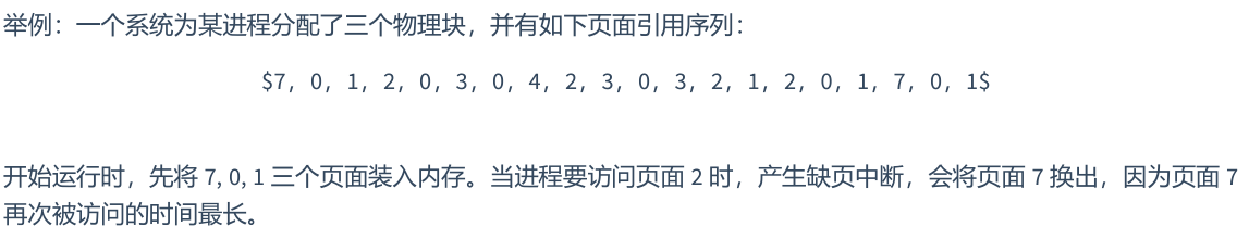 把最长时间内不再被访问的页调出,但这是理论上的方法,因为无法预知接下来调用的情况。例子如下(由页面引用结果得出,7确实在很久后才会被再次调用):