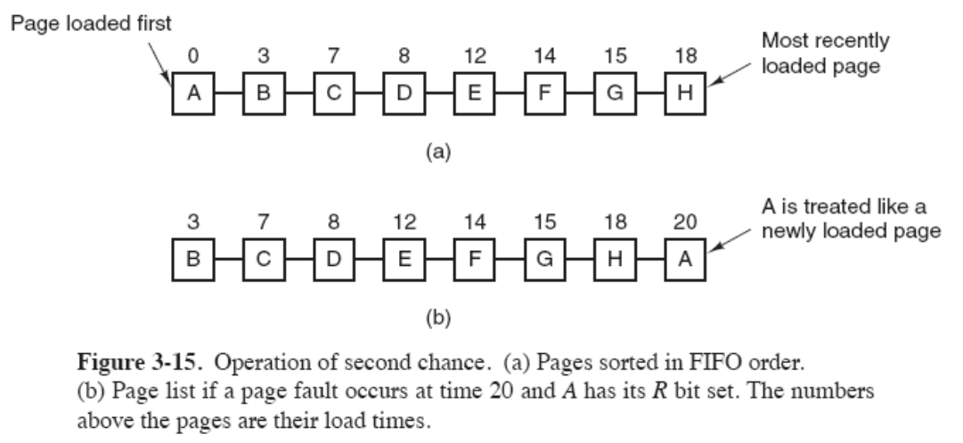 改进的FIFO算法。用一个链表来实现,如果页面被访问(读或修改),设R=1。若需要淘汰一个页时,从链首取,若链首的R=0,则淘汰;若链首R=1,则变成R=0,然后将其放到链尾(相当于给了二次机会),继续考察链首。