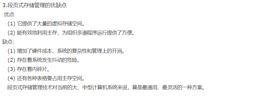 虚拟地址由段号和段内地址组成,虚拟地址到实存地址的变换通过段表来实现。每个程序设置一个段表,段表的每一个表项对应一个段,每个表项至少包括三个字段:有效位(指明该段是否已经调入主存)、段起址(该段在实存中的首地址)和段长(记录该段的实际长度)。绝对地址=根据段号找到段表中的起始地址+段内地址 (如果段内地址超过限长则产生“地址越界”程序性中断事件达到存储保护) - 优点缺点