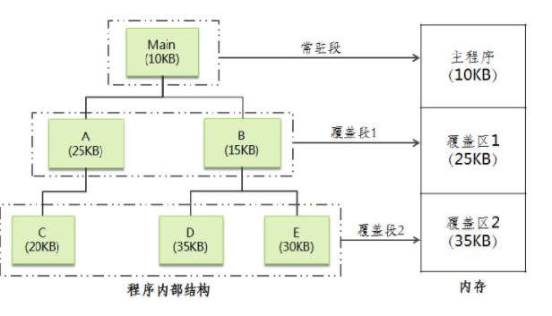 将内存空间分为若干常驻区(被某段固定占用)和覆盖区(由多段共享,可根据运行情况替换)