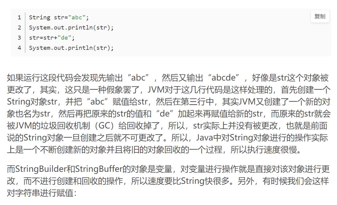 为何String最慢呢?因为String是不可变的,所以要修改时(其实就是将String指向了一个新对象,内容是修改的字符串值),涉及到创建和回收对象,所以耗时。具体解释如下: