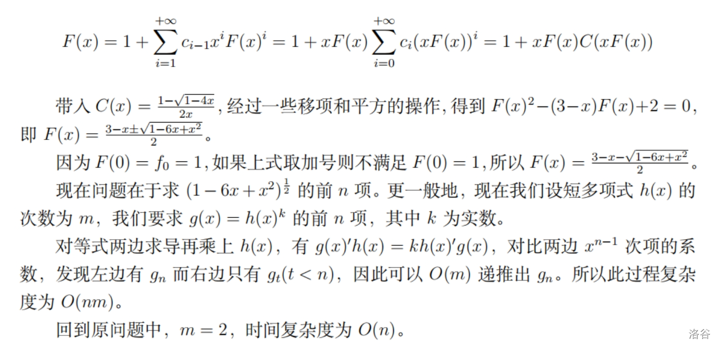 于是写出生成函数,记卡特兰数生成函数为 \(C\),原题生成函数为 \(F\)。