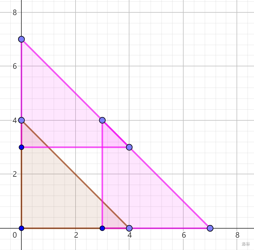 设当前可以凑出的集合为棕色三角形。如左图,加入一个 \(w_i=3\),新的可以凑出的集合为两个粉色三角形(包含边界)。此时,仍然可以凑出 \(a+b\le s'\) 的所有 \((a,b)\)。