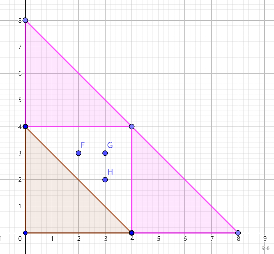 若加入一个 \(w_i=4\),则形如右图。其中 \(F,G,H\) 三个点是凑不出的。而询问的是一个矩形,故对于 \(s<a+b\le s'\) 的询问 \((a,b)\),要求 \(\min(a,b)<x_H\) 才能合法。