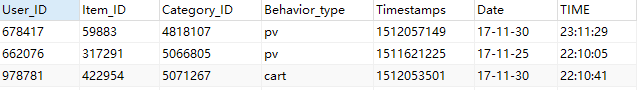 Behavior_type:用户行为类别,其中pv是点击,cart是加入购物车,fav是收藏,buy是购买