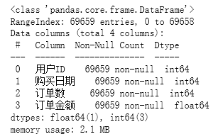 从结果可以看到原始数据没有空值,同时注意到购买日期的字段类型是int64,不是时间类型,后续的处理需要进行类型转换