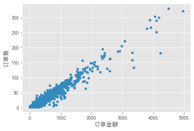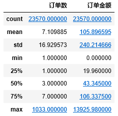 #对订单数和订单金额做描述性统计 df[['订单数', '订单金额']].describe()