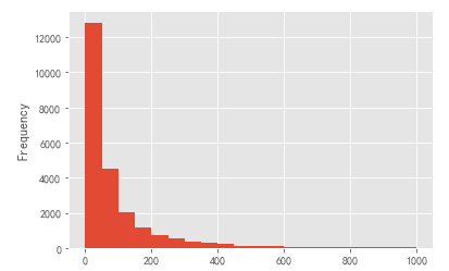 #查询条件:订单金额小于1000 group_user.query("订单金额 < 1000")['订单金额'].plot.hist(bins=20)