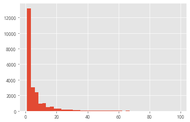 group_user.query('订单数 < 100').订单数.hist(bins = 40)