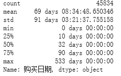 - *均每个用户的购买时间间隔是69天,间隔最长的是533天。想要召回用户,在60天左右的消费间隔是比较好的;
