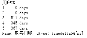 #消费的最后一天减去第一天得周期 orderdt_min=df.groupby('用户ID').购买日期.min()#第一次消费 orderdt_max=df.groupby('用户ID').购买日期.max()#最后一次消费 (orderdt_max-orderdt_min).head()