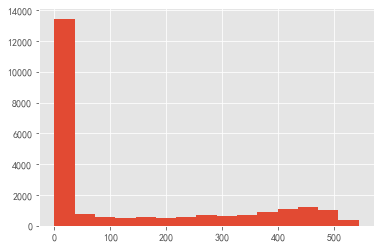 ((orderdt_max-orderdt_min)/np.timedelta64(1,'D')).hist(bins=15)