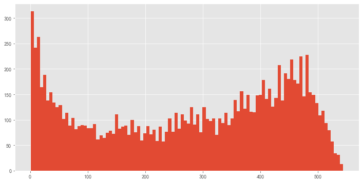 #计算所有消费过两次以上的老客的生命周期 life_time = (orderdt_max - orderdt_min).reset_index() plt.figure(figsize=(10,5)) life_time['life_time'] = life_time.购买日期 / np.timedelta64(1,'D') life_time[life_time['life_time'] > 0]['life_time'].hist(bins = 100, figsize = (12,6))