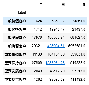 rfm = df.pivot_table(index = '用户ID', values = ['订单金额','购买日期','订单数'], aggfunc = {'订单金额':'sum', '购买日期':'max', '订单数':'sum'}) # 日期的最大值与当前日期的差值为R rfm['R'] = (rfm['购买日期'].max() - rfm['购买日期']) / np.timedelta64(1,'D') rfm.rename(columns = {'订单金额':'M', '订单数':'F'}, inplace=True) # 构建rfm模型公式 def get_rfm(x): level = x.apply(lambda x:'1' if x >= 0 else '0') label = level['R'] + level['F'] + level['M'] d = {'111':'重要价值客户', '011':'重要保持客户', '101':'重要挽留客户', '001':'重要发展客户', '110':'一般价值客户', '010':'一般保持客户', '100':'一般挽留客户', '000':'一般发展客户'} result = d[label] return result rfm['label'] = rfm[['R','F','M']].apply(lambda x:(x-x.mean()) / x.std()).apply(get_rfm,axis=1)