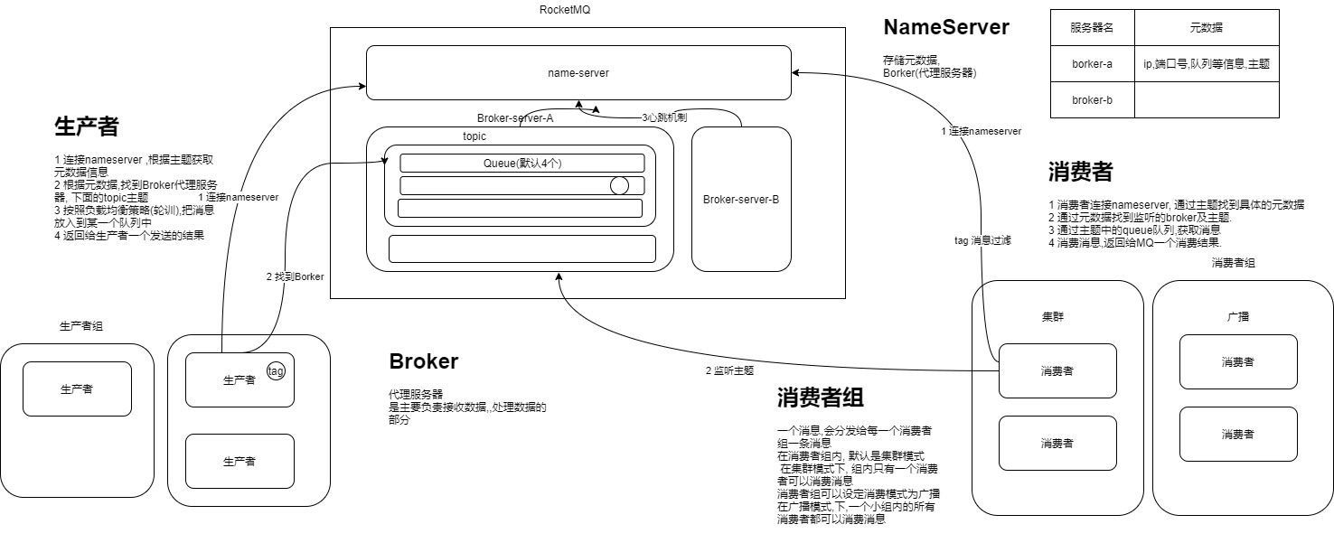 - 消费者连接nameserver,通过主题找到具体的元数据,通过元数据找到监听的broken及主题,通过主题中的queue队列,获取消息,消费消息,返回给MQ一个消费结果。