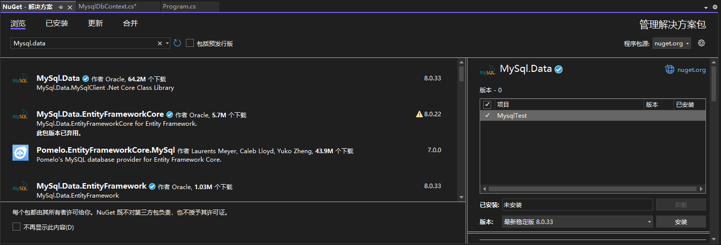 打开 工具 -> NuGet包管理器 -> 管理解决方案的NuGet程序包,搜索Mysql.Data并根据自身情况选择版本安装,至此,开发基础准备完成。