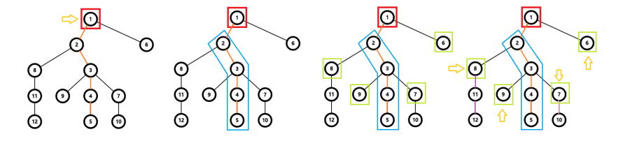 在这幅图中,黄色箭头表示将要递归的子树;橙色边是重边;蓝色的框是重儿子;绿色框是重链两边的轻儿子。