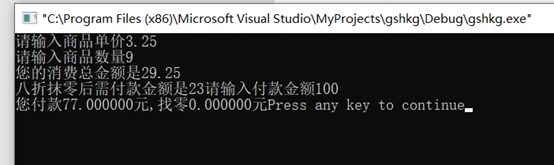 #include<stdio.h>main(){ double price,sum,pay,zhaoling; int num,moling; printf("请输入商品单价"); scanf("%lf",&price); printf("请输入商品数量"); scanf("%d",&num); sum=price*num; printf("您的消费总金额是%.2lf\n",sum); moling=(int)(sum*0.8); printf("八折抹零后需付款金额是%d",moling); printf("请输入付款金额"); scanf("%lf",&pay); zhaoling=pay-moling; printf("您付款%lf元,找零%lf元",zhaoling);}