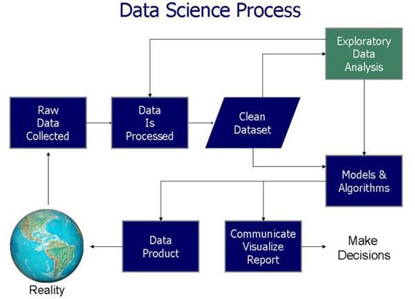 图2 典型的数据科学过程:包括原始数据采集,数据预处理和清洗,数据探索式分析,数据计算建模,数据可视化和报表,数据产品和决策支持等。