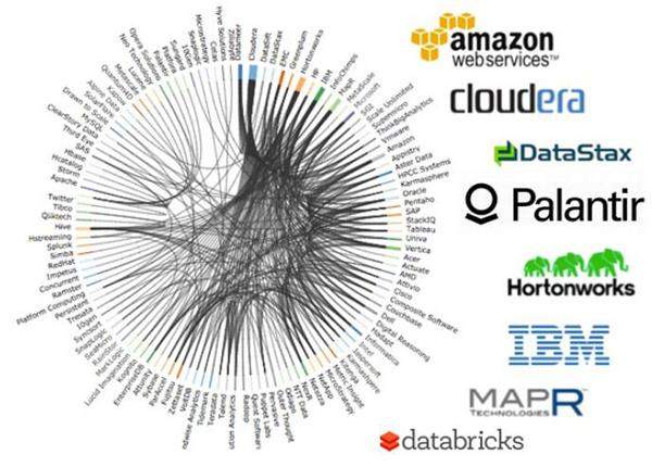 图1 国外大数据企业关系图,传统信息技术企业也在向智能化发展,与新兴大数据企业互为竞争和支持。