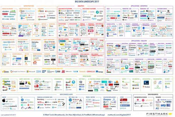可见DT这种新技术泛型生态下的大数据版图十分庞杂,当然也有泡沫的成分存在,这个版图也会时刻处于变化之中,就像PC时代的应用程序,互联网上的网站,移动互联网的APP,大数据时代的技术和产品也正处于优胜劣汰的过程。下面我们来看2017版的大数据版图: