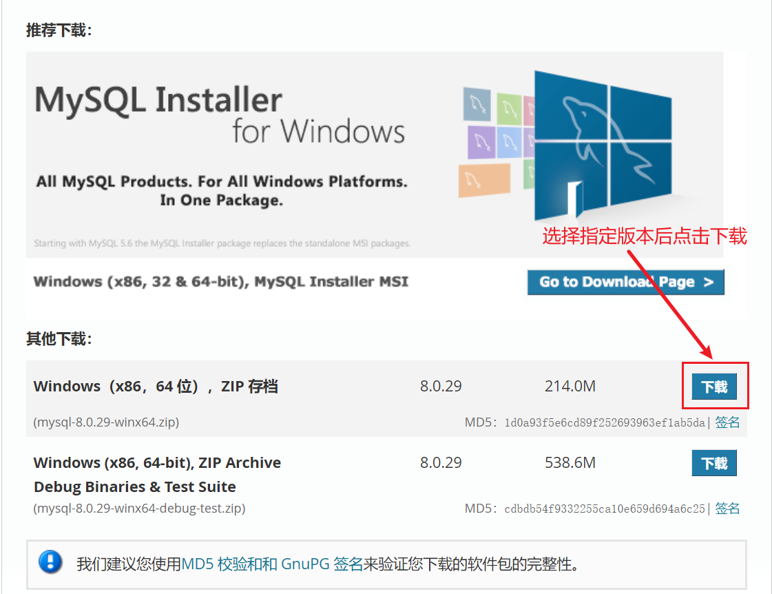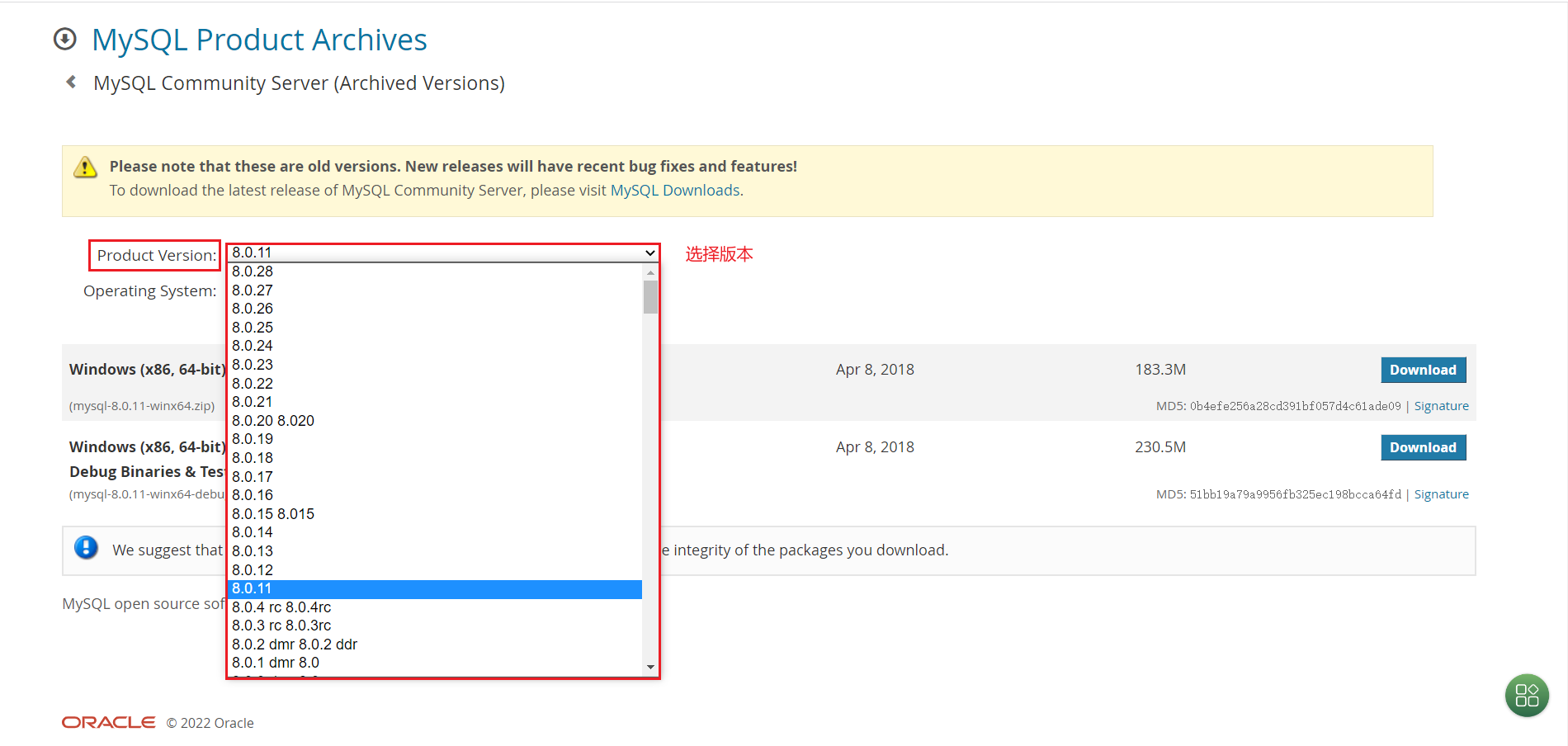 想下载往期版本可以选择指定版本瞎下载:https://downloads.mysql.com/archives/community/