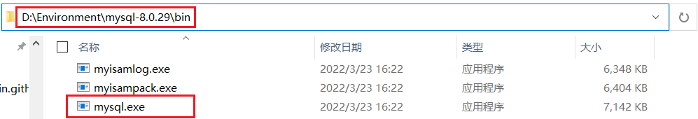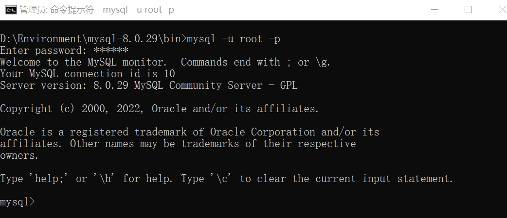 C:\WINDOWS\system32>d: D:\>cd D:\Environment\mysql-8.0.29\bin