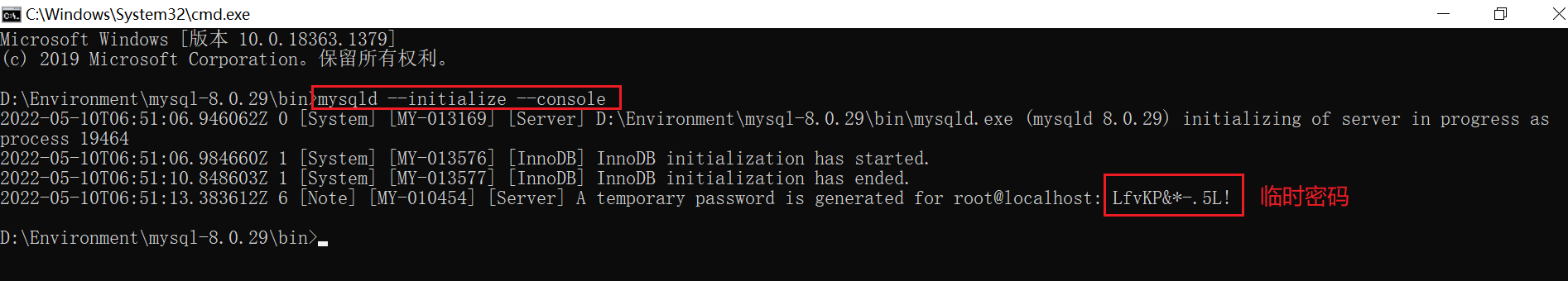 D:\Environment\mysql-8.0.29\bin>mysqld --initialize --console注意记住这个临时密码,后面会用到;